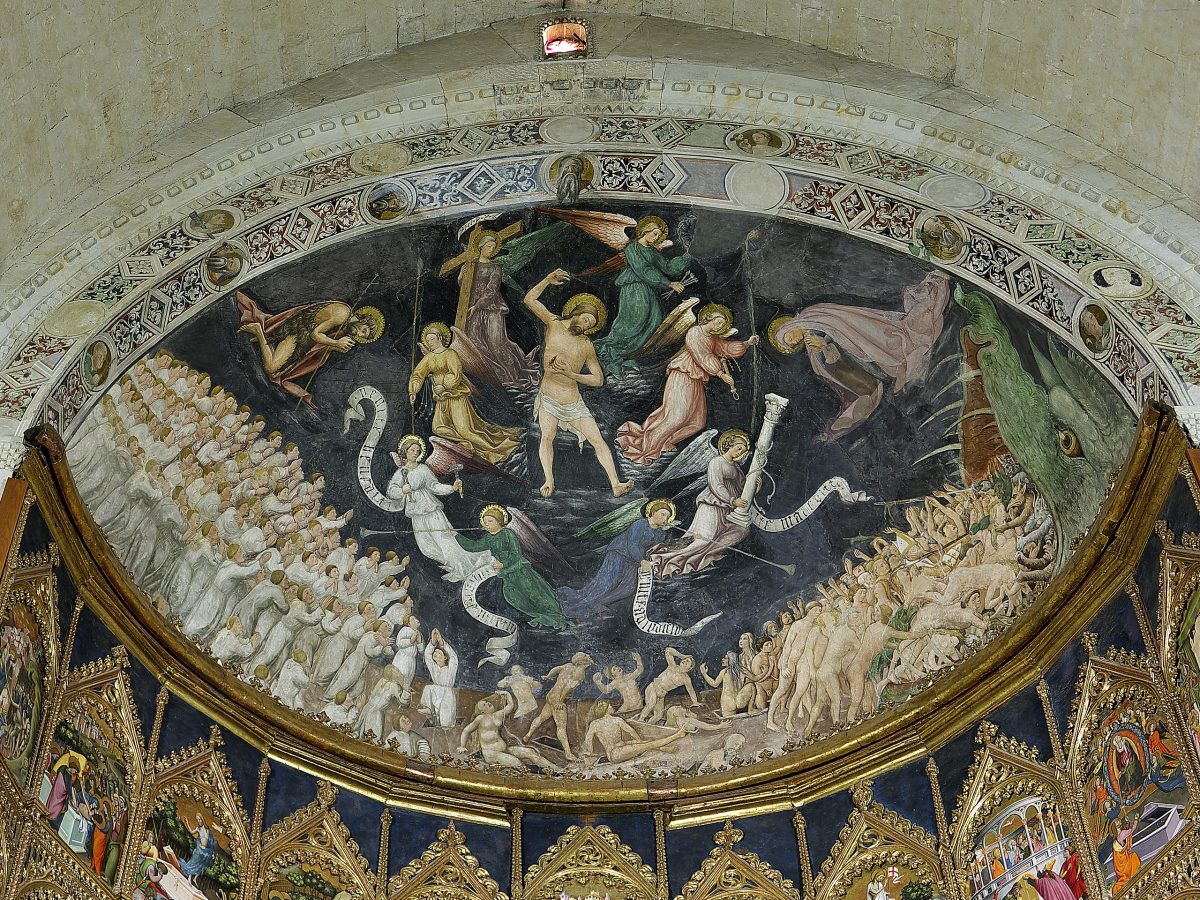 This artwork is part of the ceiling of the Old Cathedral of Salamanca in Spain. It shows the scene of final judgement and resurrection from the Book of Revelation.