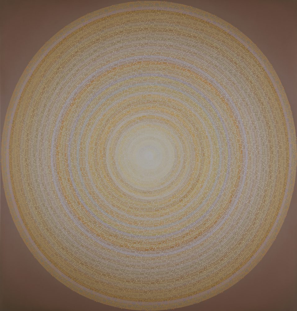 The Circle of Peace, a painting designed by Sir David Khalili. The word “peace” in English, Hebrew, and Arabic, is arranged in circles around a central point. This is one of five paintings by the artist Ben Johnson commissioned by Sir David for the House of Peace.