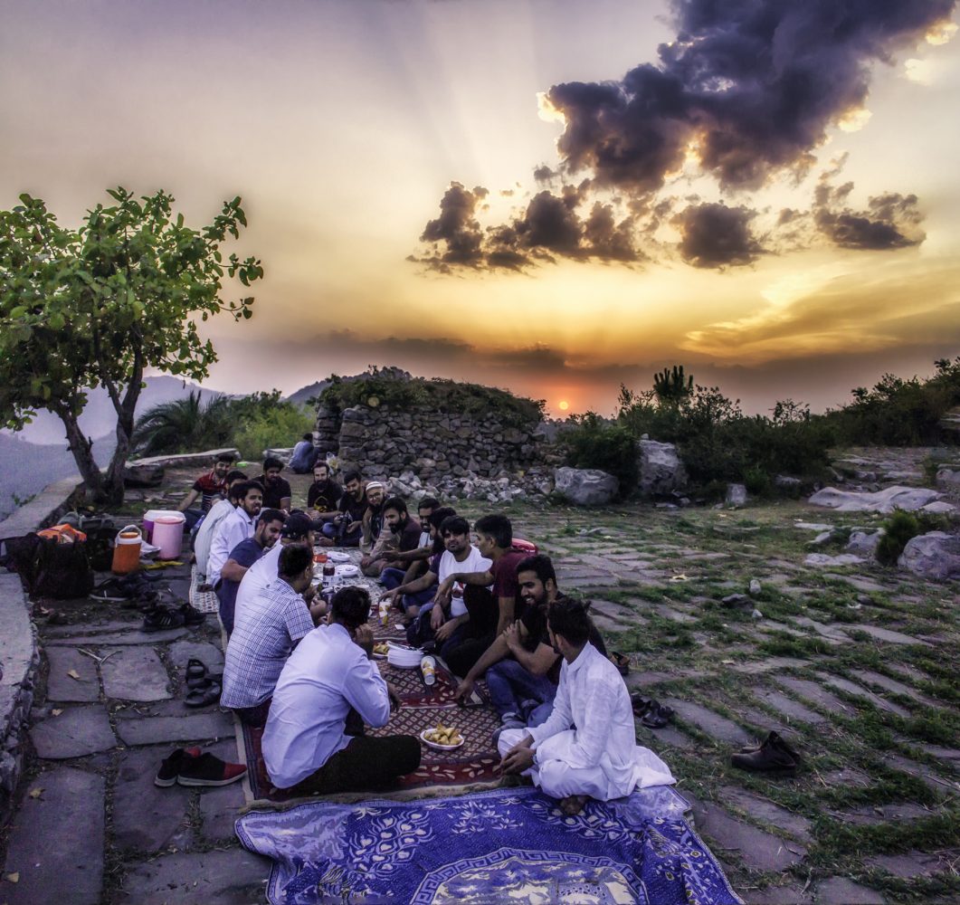 The photograph shows an iftar (meal to celebrate the end of the Ramadan fast) in the hills near Islamabad, Pakistan.