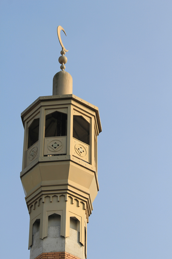 The adhān is the Islamic call to prayer. A person called a muezzin usually performs the adhān. The adhān usually happens five times a day. Originally, the muezzin would read the adhān from the minaret (tower) or front door of a mosque. Today, many mosques have loudspeakers to amplify the adhān so the muezzin does not need to stand in the minaret.