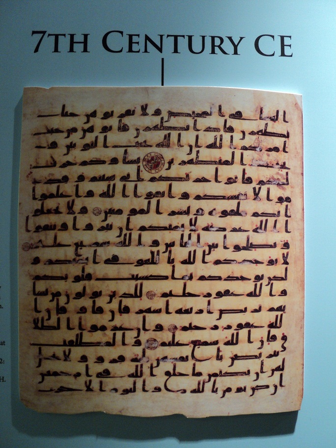 A page of writing from a Qur’an. This is from the 7th century CE (roughly the 1st century of the Hijri calendar).