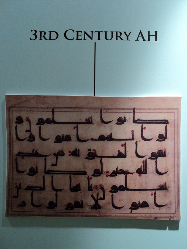 Page of writing from the Qur’an. This dates from the 3rd century of the Hijri calendar, roughly corresponding to the 9th century of the Common Era.