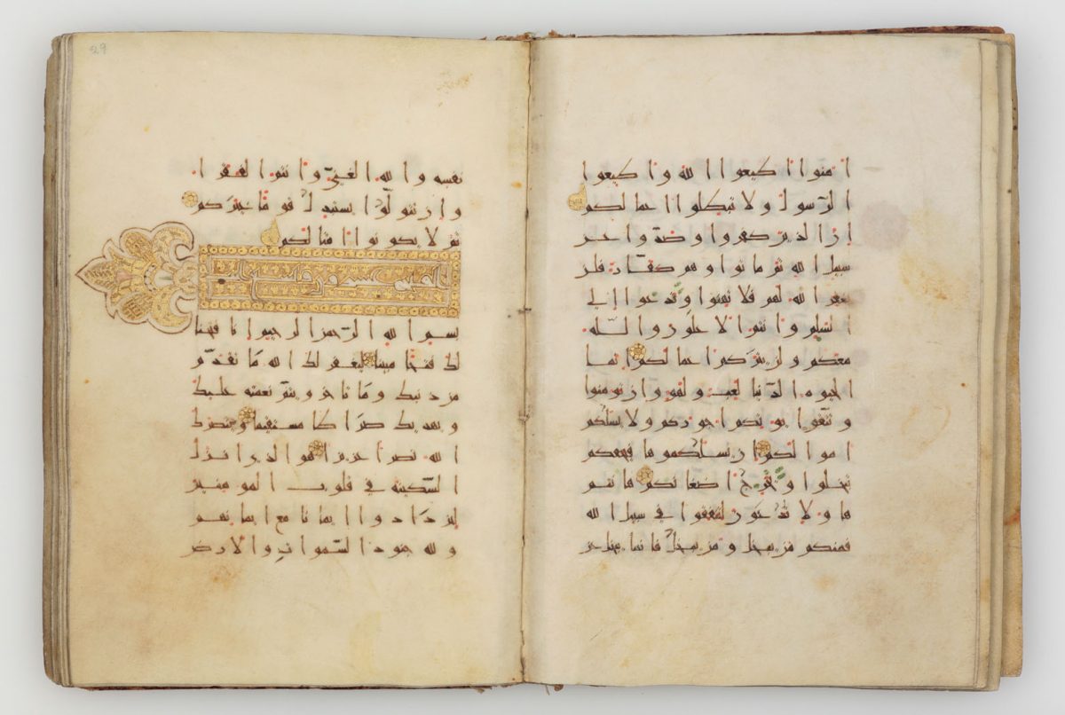 This photo shows a manuscript (hand-written) Qur’an from the 10th century CE, with a gold heading to indicate the start of a new surah.
